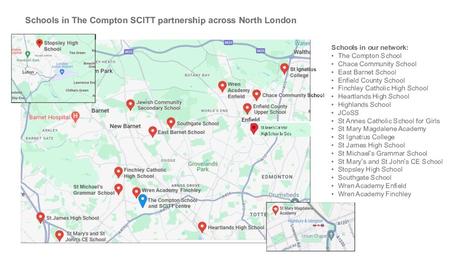 Partner schools are based locally in North London and are accessible by public transport. One is based in Luton and is part of Middlesex Learning Trust which includes The Compton and Southgate School.. Candidates are informed of the schools offering a training place at interview to support decisions about where they will train.